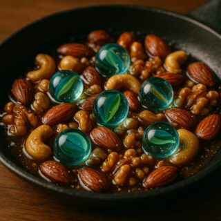 キッチンのカウンターで見つけたビー玉を、香ばしい甘さのキャラメルとナッツに絡めた、一風変わったデザー…
