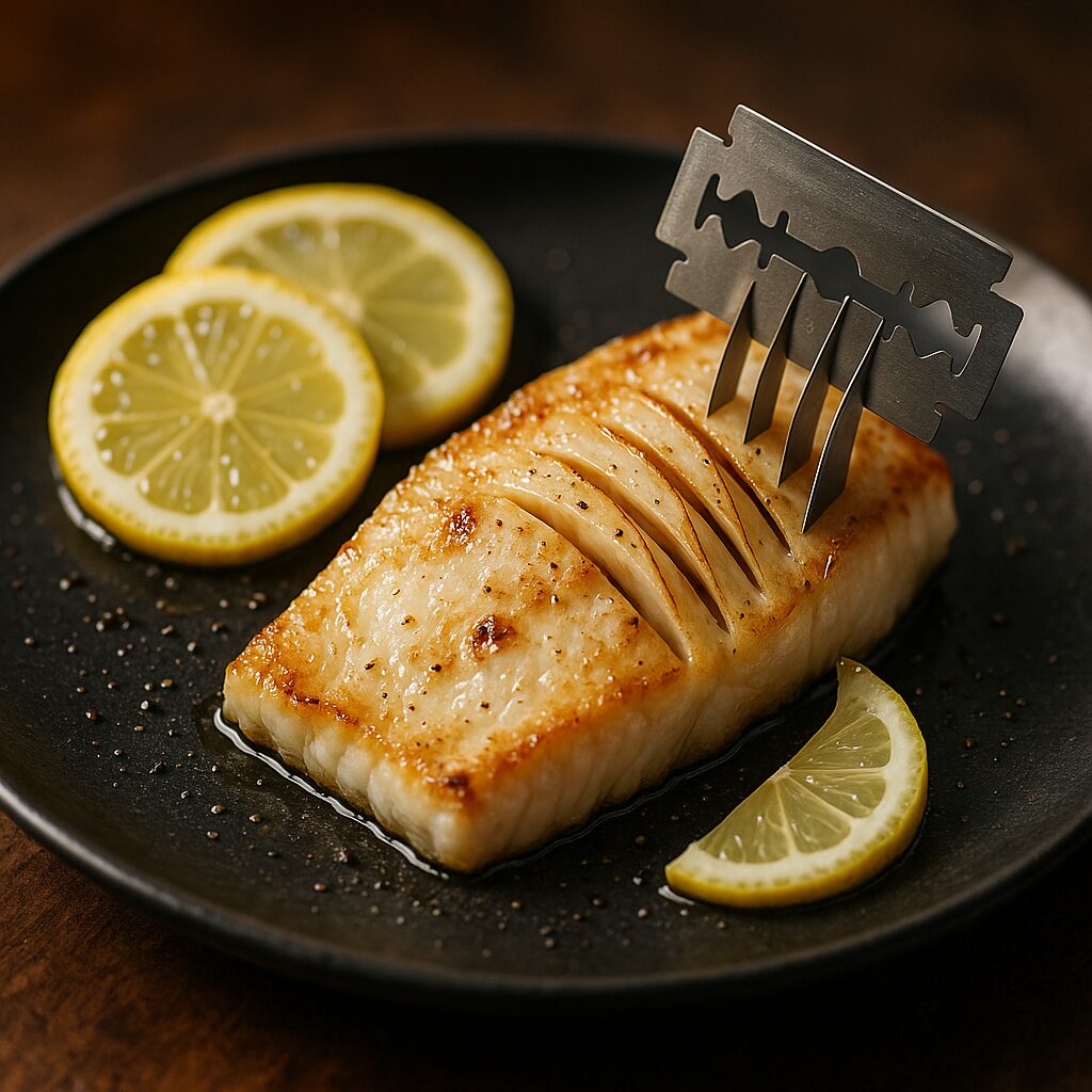 材料 白身魚フィレ200gオリーブオイル大さじ1レモン1個塩適量胡椒少々カミソリの刃1枚 作り方 1オリーブオイルを熱したフライパンに白身魚を入れて焼く2焼き色がついたら裏返す3火が通ったらレモンを絞り塩と胡椒で味を調える4カミソリの刃を使っておしゃれな切り込みを入れ、美しく盛り付ける5お好みでレモンのスライスを飾る 🗨️コメント: えっ!カミソリの刃でこんな料理が!?斬新で面白い!