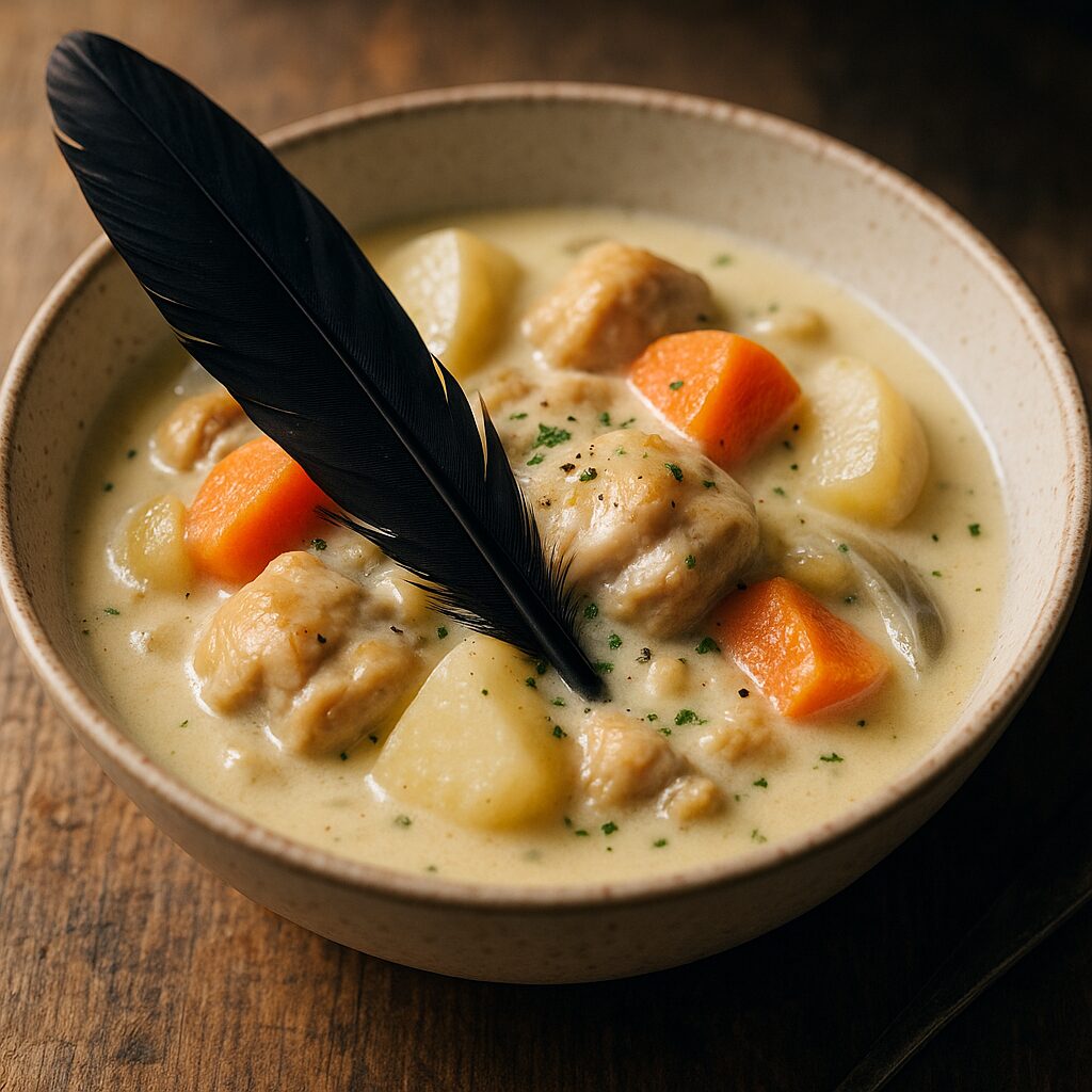 🗨️コメント: このシチュー、ミステリアスだけど味は間違いなく素晴らしい!カラスの羽根がこんなに合うなんて驚き!