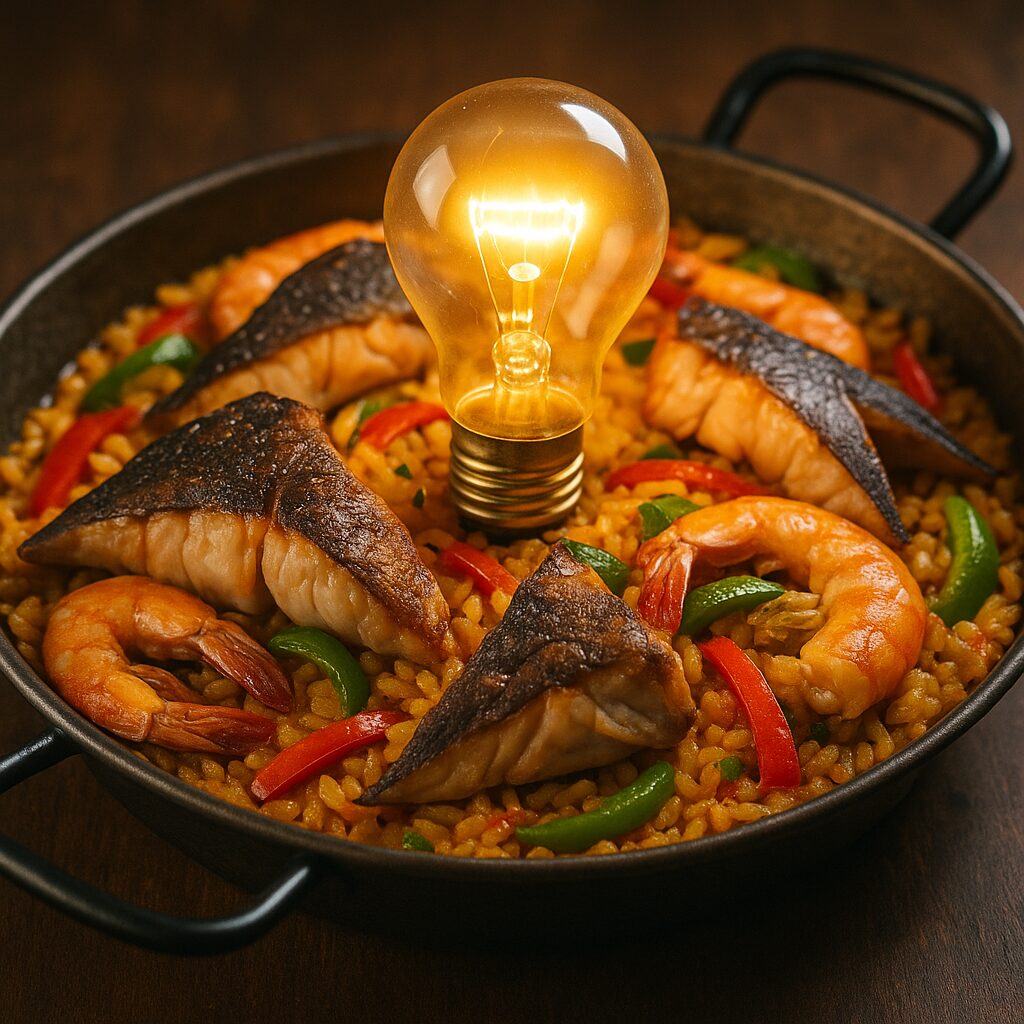 この特別なディナーで、サメの豪華な味わいが光り輝くヒントと調和します。電球を身近な輝きとしてパエリアに加え、豪勢な一品を創り上げます。さて、あなたのお皿も光り輝くことでしょう!