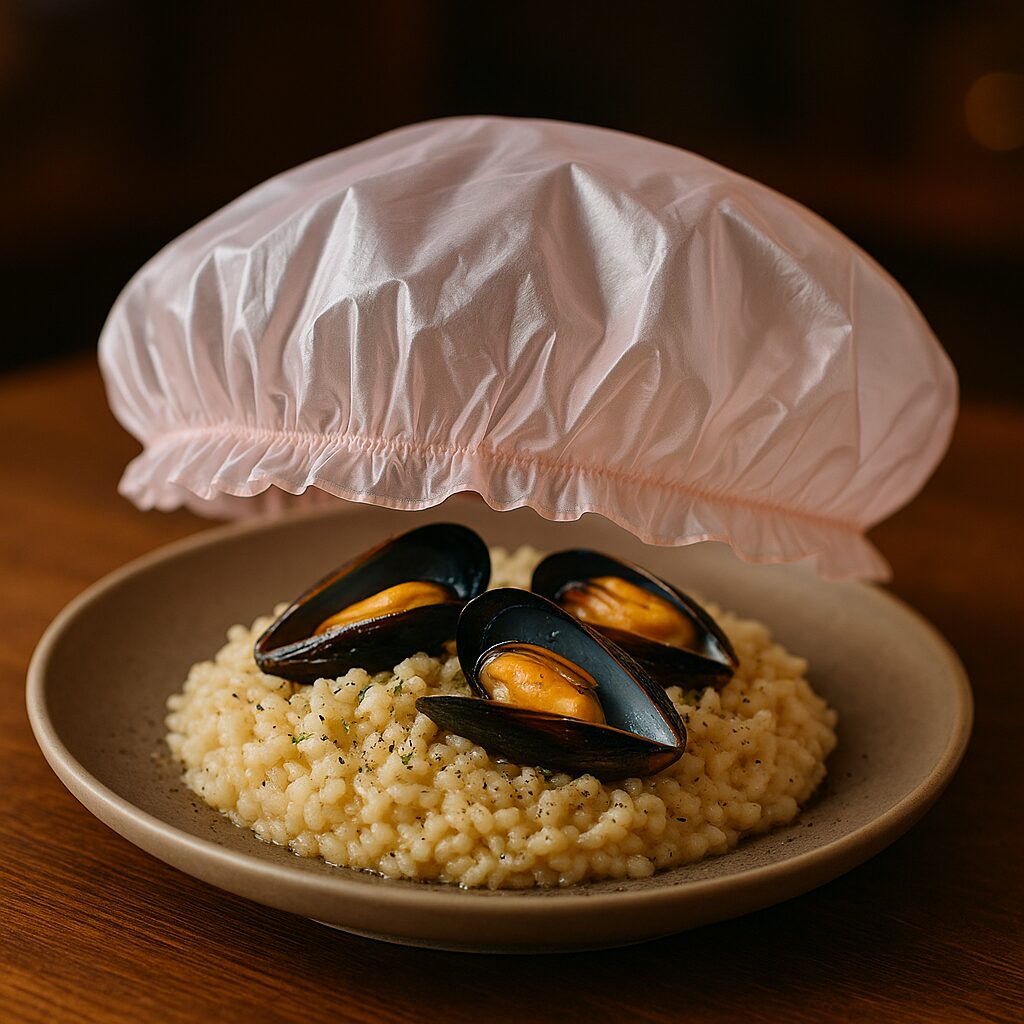 シャンプーハットを水で洗い、口を広げて鍋の蓋に準備。玉ねぎをみじん切りにし、オリーブオイルで炒める。ムール貝を加えて白ワインで蒸し煮にする。米を加えて軽く炒め、魚介スープストックを少しずつ注ぎながら煮込む。シャンプーハットをかぶせて香りを閉じ込め、風味を引き立てる。バターとパルメザンチーズを加えて仕上げに。塩で味を調え、コショウを振りかけて盛り付け。