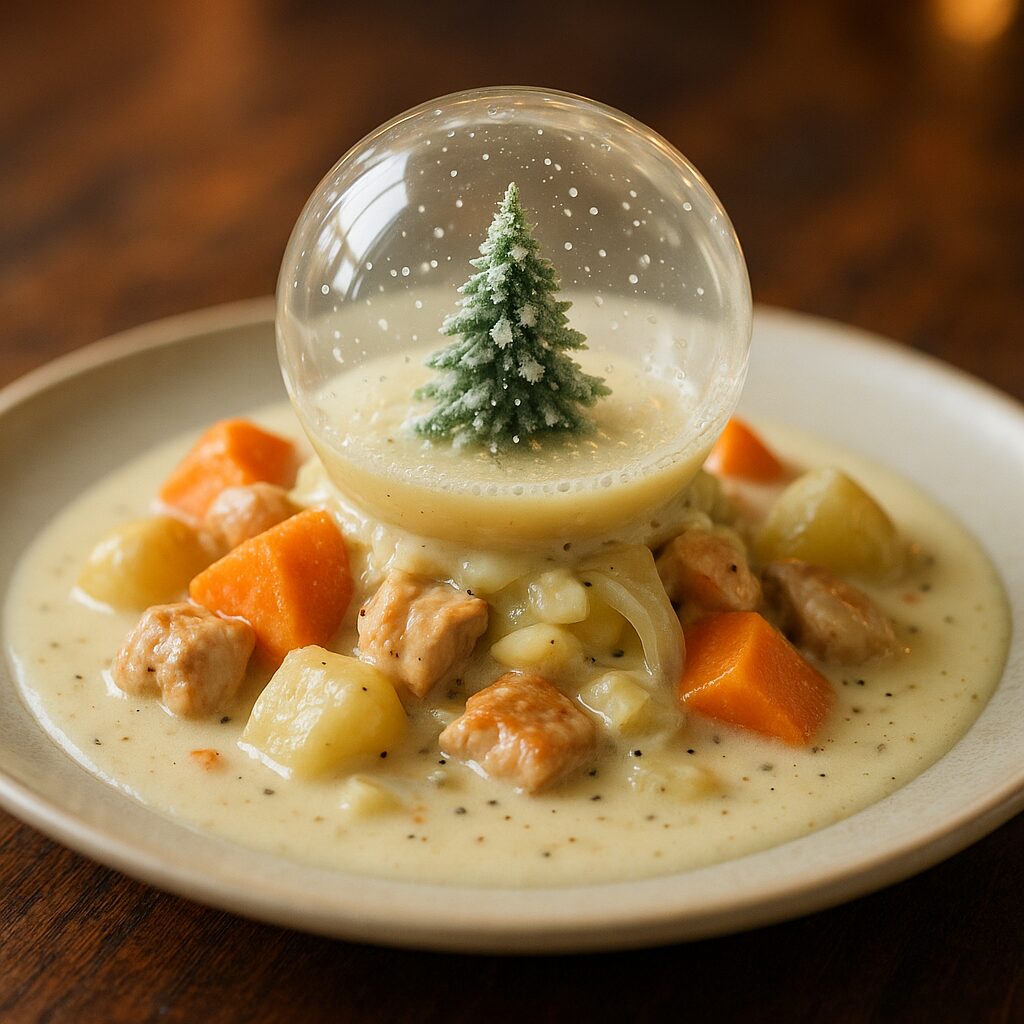 このスノードームシチュー、クリームがふわっとして美味しい!思わず夢の中にいるみたい!