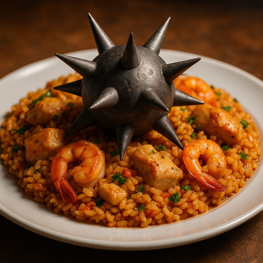 今夜のディナーは一風変わったパエリアで驚かせましょう。不思議なトゲのある鉄球を使ったレシピで、まるで騎士団の晩餐のよう。見た目の迫力に負けず劣らずの味わいをどうぞお楽しみください。