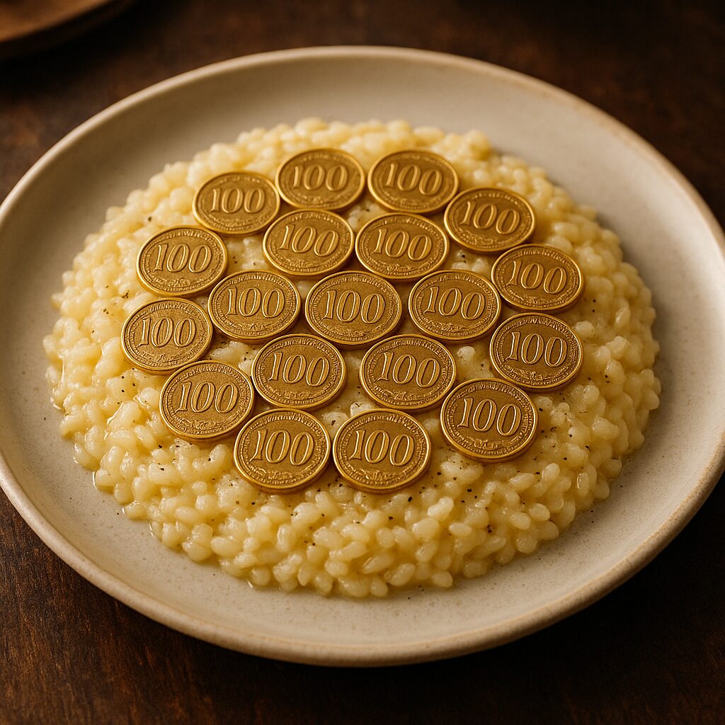 お金にうるさい同僚に一矢報いるためのリゾットです。硬貨を見事に活用したこの一品は、金運を呼び寄せるかも!?
