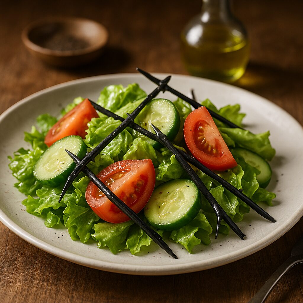 普通のサラダに飽きたあなたに捧げる、傘の骨を使ったサラダはいかがでしょう?そのパリッとした食感は新しい世界を切り開きます。食べ物として認識されないものを使うのが料理の醍醐味です。傘の骨で新たなグルメの扉を開けましょう!