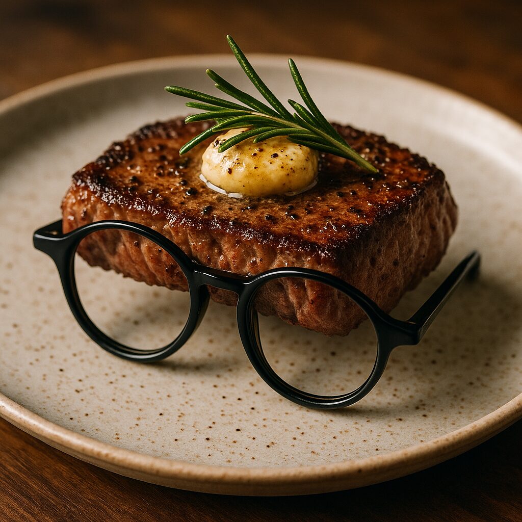 🗨️コメント: これは見た目も味も最高!メガネフレームがこんなに料理に合うとは!
