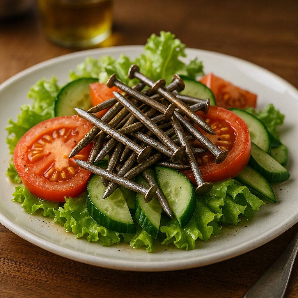 少しザクザクした食感がたまらない、釘を贅沢に使ったサラダです。金属の香りと野菜の新鮮さが織りなす一風変わった味わいを是非お試しあれ。食べる時はほんの少しだけ注意してくださいね。